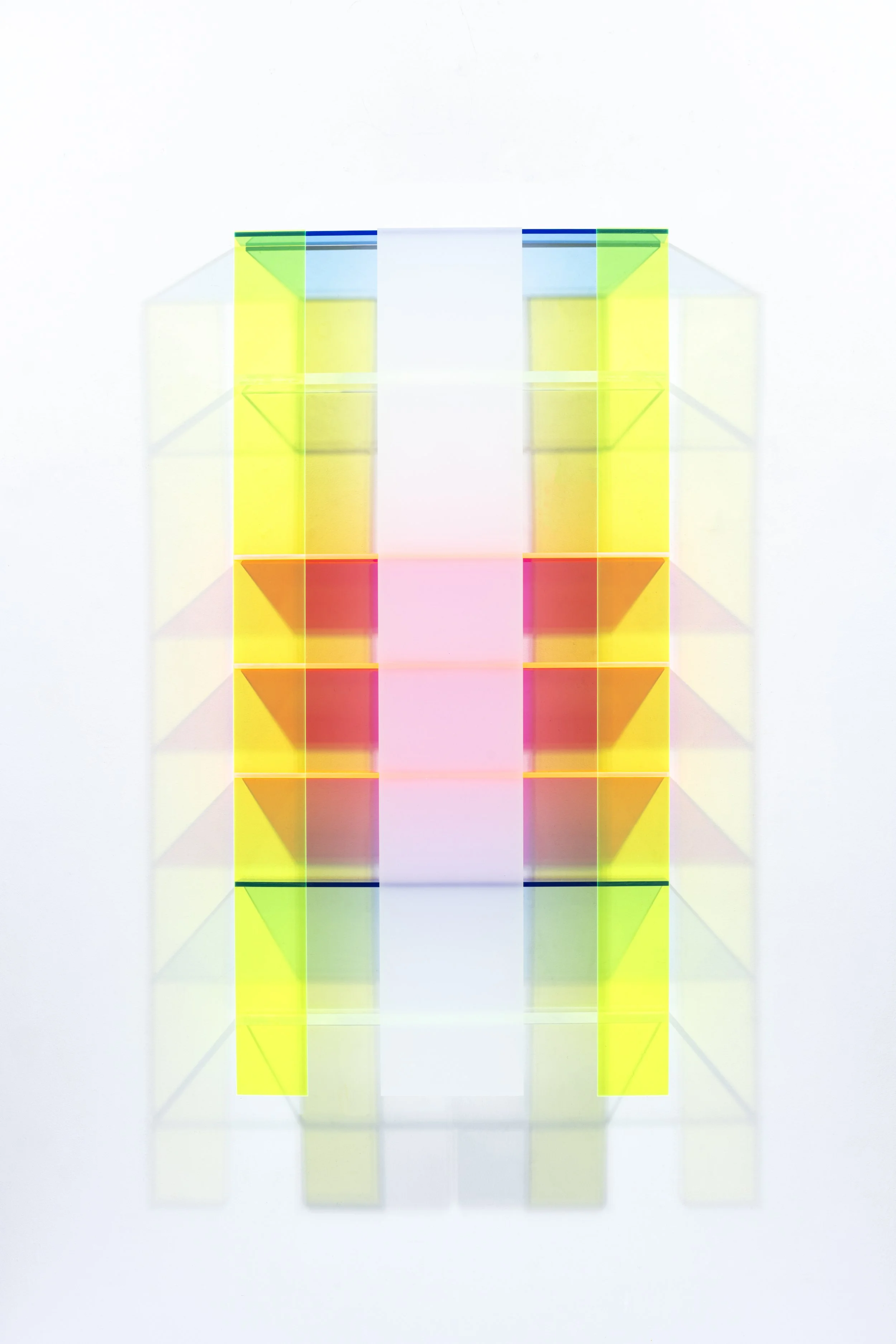 Working in nonrepresentational painting since the mid-1970s, Haub began incorporating colored cast acrylic sheets as supports in the late 1980s, eventually transitioning to relief works composed entirely of Plexiglas. These works begin with cast acrylic in liquid form, which, once cured, is cut, arranged, and bonded into layered, rectilinear compositions. The resulting pieces explore color, light, shadow, transparency, and opacity within the disciplined framework of gridded matrices.