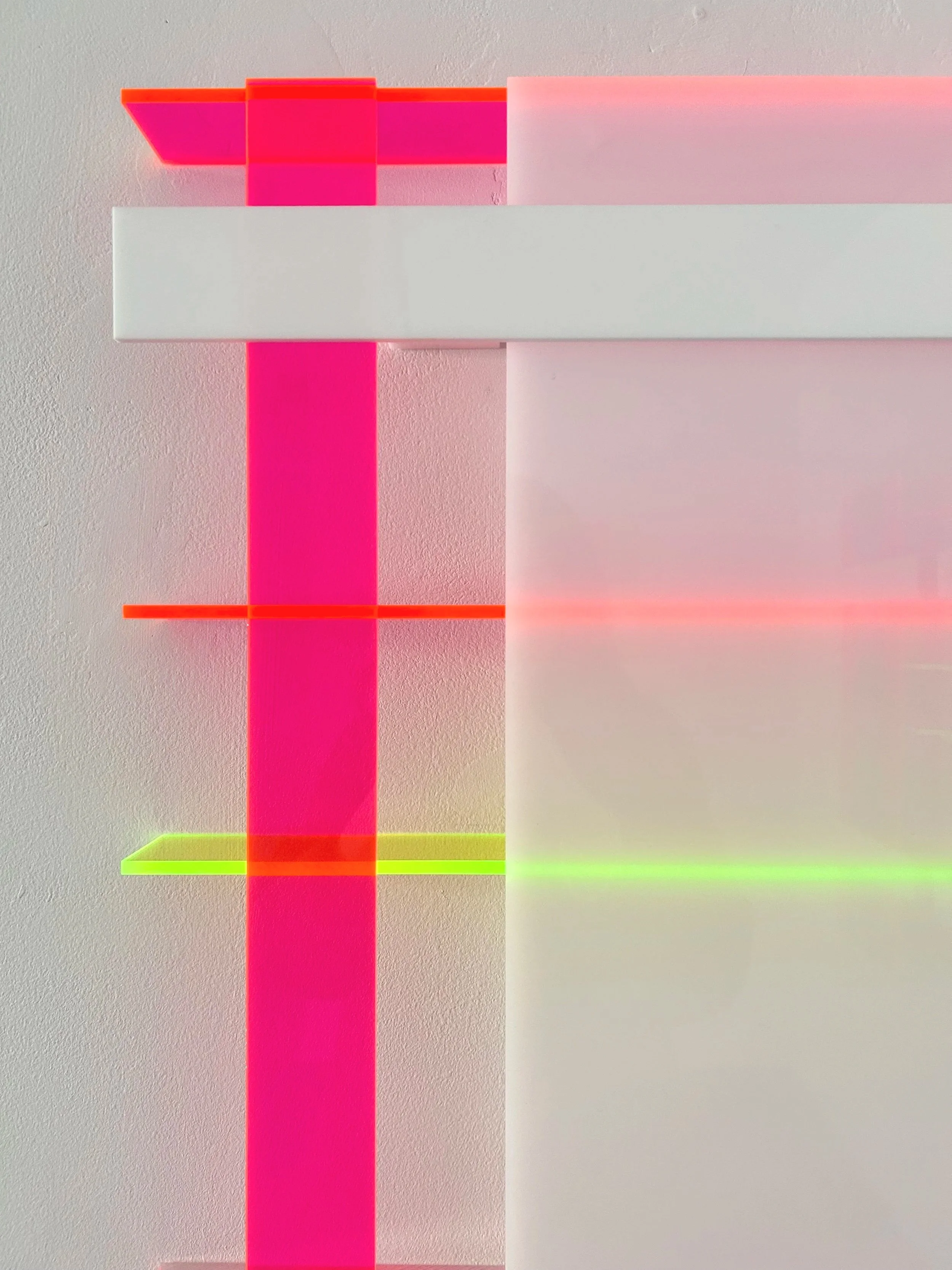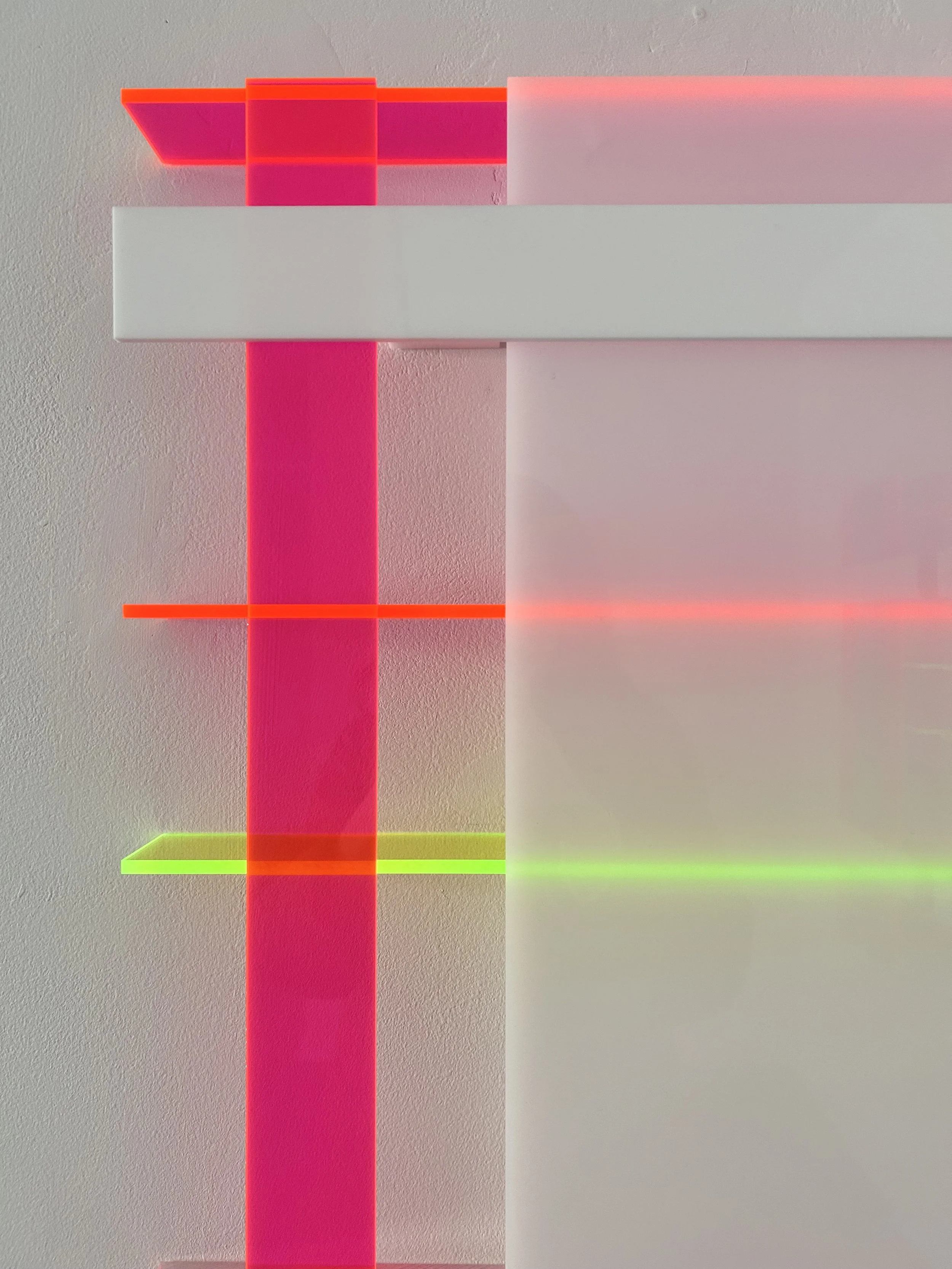 I see the works as like fresco and watercolor—color cast onto and illuminated by the ground. I also think a lot about Matisse’s paper cutouts. My plexi is a sheet of cast acrylic, which, starting out as a liquid, is then cut into pieces and bonded together. I am free to move the parts around as much as I like before fixing them, like collage.